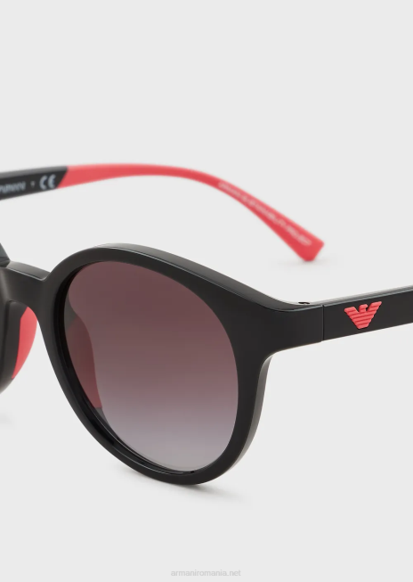 ochelari de soare rotunzi din fibră de bio-nylon. tâmple cu vârfuri din cauciuc și logo-ul vultur din cauciuc asortat. tampoanele din silicon le fac confortabil de purtat. sigla proiectului de sustenabilitate armani pe interiorul templului.