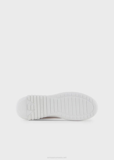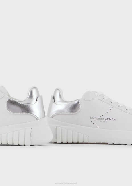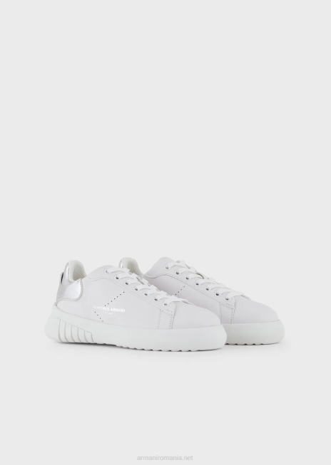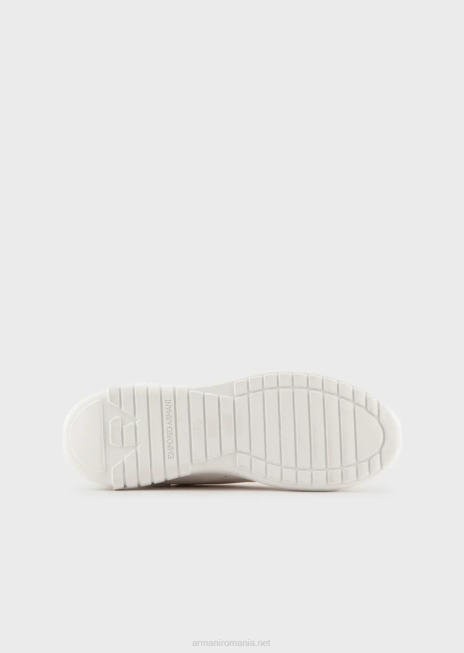 o selecție de încălțăminte care a fost creată pentru a renova și moderniza linia de iconițe. adidași din piele revitalizați cu o atingere laminată pe spate. logo emporio armani milano pe lateral.