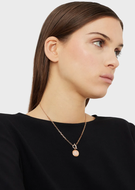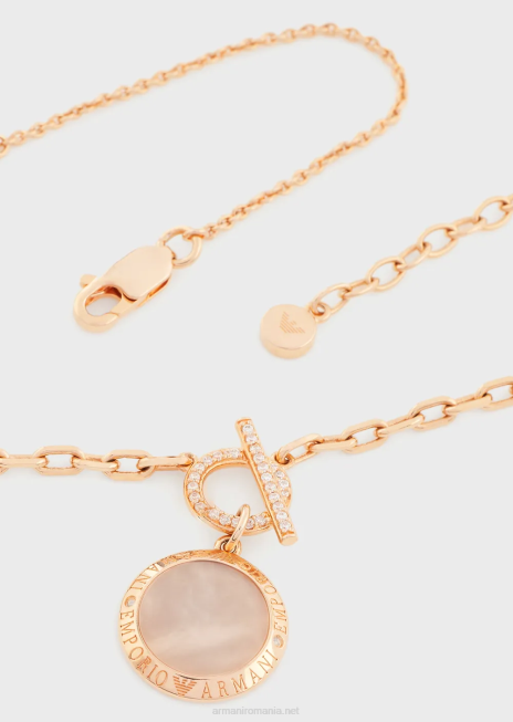 colier cu pandantiv cu sidef de piersică, argint sterling auriu roz și închidere tip homar.