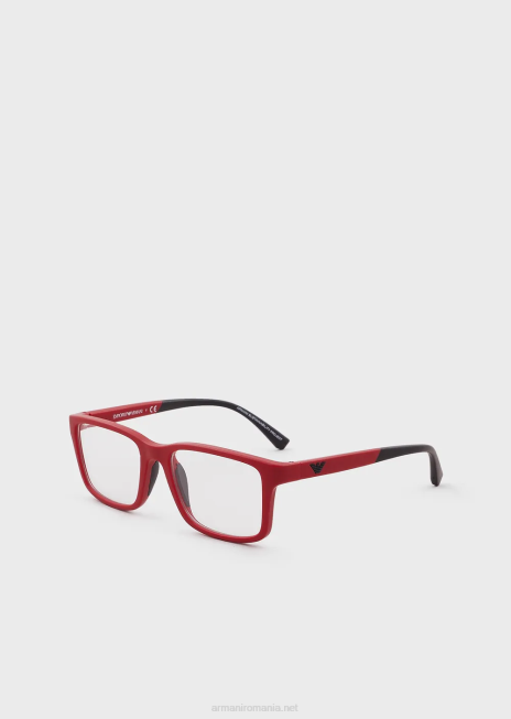 ochelari pătrați ecologici pentru băieți din fibră ultrauşoară din bio-nylon. tâmple cu vârfuri din cauciuc și logo-ul vultur din cauciuc asortat. tampoanele din silicon le fac confortabil de purtat. sigla proiectului de sustenabilitate armani pe interiorul templului.