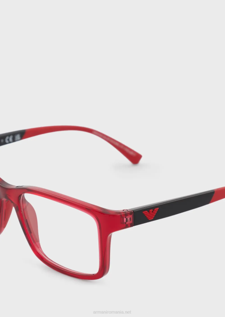 ochelari pătrați ecologici pentru băieți din fibră ultrauşoară din bio-nylon. tâmple cu vârfuri din cauciuc și logo-ul vultur din cauciuc asortat. tampoanele din silicon le fac confortabil de purtat. sigla proiectului de sustenabilitate armani pe interiorul templului.