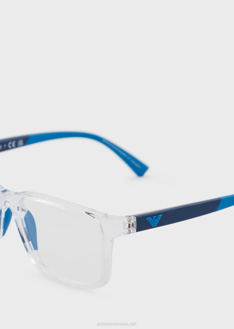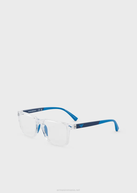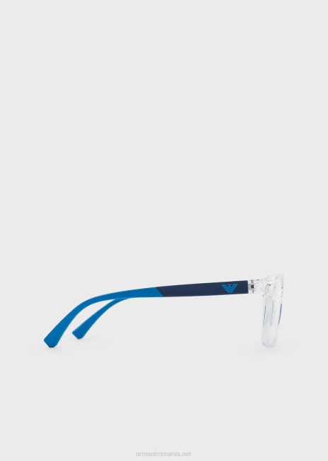ochelari pătrați ecologici pentru băieți din fibră ultrauşoară din bio-nylon. tâmple cu vârfuri din cauciuc și logo-ul vultur din cauciuc asortat. tampoanele din silicon le fac confortabil de purtat. sigla proiectului de sustenabilitate armani pe interiorul templului.