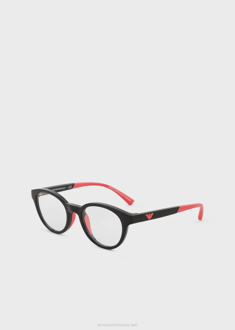 Ochelari rotunzi ecologici pentru fete din fibră ultra-uşoară din bio-nylon. tâmple cu vârfuri din cauciuc și logo-ul vultur din cauciuc asortat. sigla proiectului de sustenabilitate armani pe interiorul templului.