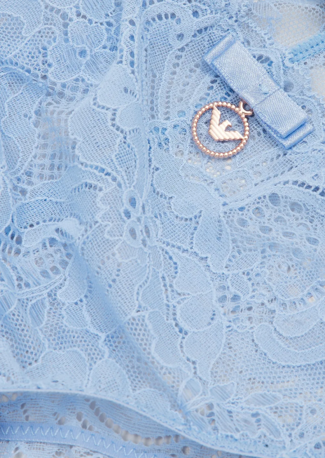 slip din dantelă fabricat din nailon reciclat certificat, care susțin producția circulară, ecologică. fundă asortată și medalion cu logo. echipat cu o etichetă informativă, acest articol face parte din proiectul de sustenabilitate armani, prezentând produse realizate folosind țesături durabile și metode de producție care respectă mediul.