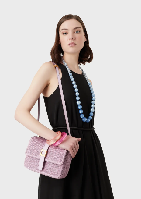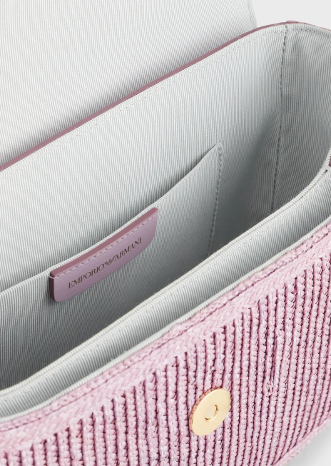 linii curate super minimaliste, cu mici note de metal. aceste genți prezintă volume îndrăznețe și o siluetă foarte geometrică. Geantă crossbody din rafie cu închidere cu clapă pentru a fi introdusă într-o buclă metalică cu logo. feronerie de aur. dimensiuni: 23,5 x 17,5 x 6 cm.