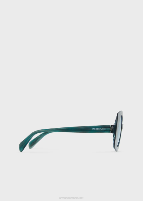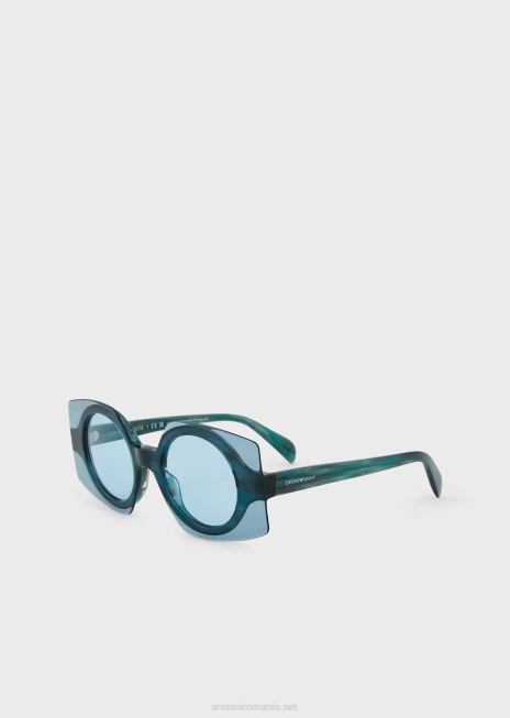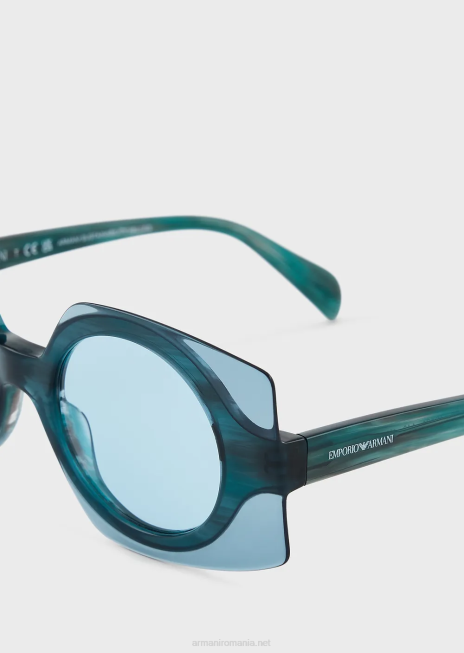 ochelari de soare de damă cu structură de acetat într-un design futurist, având o construcție dublă cu formă rotundă interioară și formă pătrată exterioară transparentă. temple cu logo-ul emporio armani pe lateral.