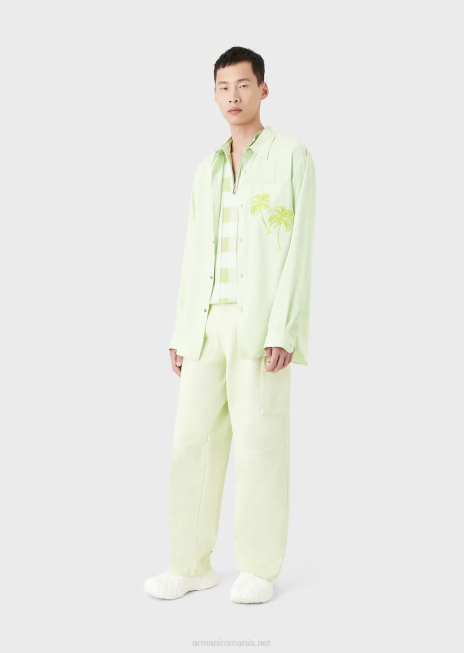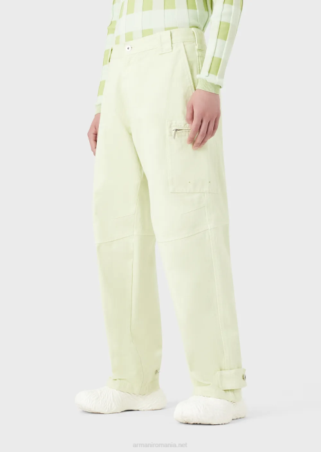 pantaloni într-un stil tipic de pantalon cargo largi, largi. denimul ușor din bumbac pur cu efect de pânză conferă piesei o alură modernă, avangardă, dar fără vârstă prin textura sa veșnic verde și emblematică. Bucle supradimensionate pentru curea în talie și o curea la gleznă completează piesa cu stil.